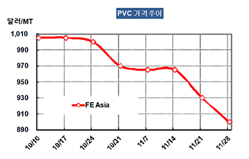 PVC 가격은 11월26일 CFR China 톤당 900달러로 30달러 폭락했다.