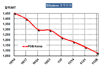 에틸렌 가격은 11월28일 FOB Korea 톤당 1075달러로 55달러 급락했다.
