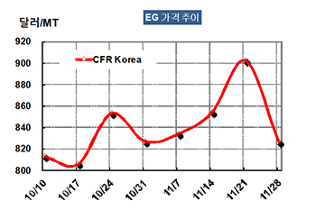MEG 가격은 11월28일 CFR China 톤당 826달러로 76달러 폭락했다.