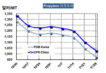 프로필렌 가격은 11월28일 FOB Korea 톤당 970달러로 75달러 폭락했다.