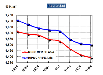 GPPS 가격은 11월26일 CFR China 톤당 1390달러로 25달러 급락했다.