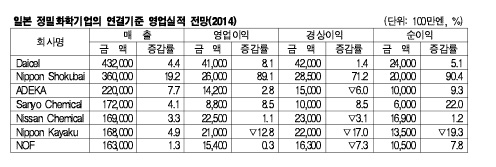 일본 정밀화학기업들이 2014년 2/4분기 양호한 영업실적을 기록했다.