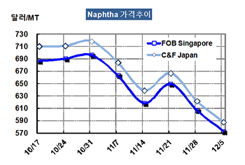 나프타 가격은 12월5일 CFR Japan 톤당 588달러로 33달러 급락했다.