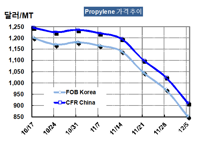 프로필렌 가격은 12월5일 FOB Korea 톤당 850달러로 120달러 폭락했다. CFR China는 920-930달러에 오퍼했으나 바이어들이 지나치게 높다며 구매를 거부해 910달러까지 떨어진 것으로 알려졌다. 표,그래프: < 프로필렌 가격추이 > <화학저널 2014/12/09> |