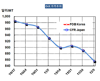 O-X 가격은 12월5일 FOB Korea 톤당 855달러로 35달러 급락했다.