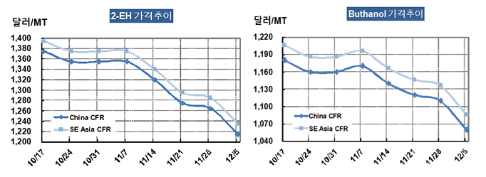 표,그래프: < 2-EH 가격추이 > < Buthanol 가격추이 > <화학저널 2014/12/12> |