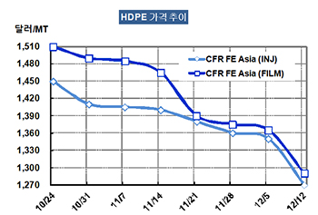 HDPE 가격은 12월10일 CFR FE Asia 톤당 1270달러로 80달러 폭락했다.
