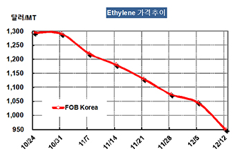 에틸렌 가격은 12월12일 FOB Korea 톤당 950달러로 95달러 폭락했다.