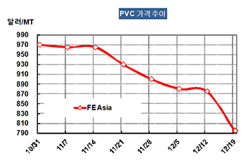 PVC 가격은 12월17일 CFR China 톤당 795달러로 80달러 폭락했다.