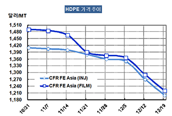 HDPE 가격은 12월17일 CFR FE Asia 톤당 1200달러로 70달러 폭락했다.