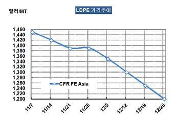 LDPE 가격은 12월24일 CFR FE Asia 톤당 1200달러로 50달러 폭락했다.