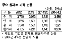 ![]() 삼화페인트(대표 김장연)는 12월24일 주당 1만4900원에 거래돼 전일대비 9.16% 급등했으며, 조광페인트는 1만650원으로 9.79%, 건설화학은 4만7350원으로 6.52%, 노루페인트는 8170원으로 4.34% 올라 강세를 이어갔다. 페인트기업이 국제유가 하락으로 수혜를 보고 있는 것은 유성페인트의 원재료 가격이 직접적인 영향을 받기 때문으로 분석된다. 최근 국제유가 하락으로 원재료가 낮은 가격에 유입되면서 2015년 상반기경에는 원가 산정에 반영될 예정이어서 영업실적 개선도 기대되고 있다. ![]() 노루페인트 관계자는 “2013년에는 원재료 가격이 수지와 첨가제류에서 소폭 상승했으나 2014년에는 지속적으로 하락하고 있다”며 “유가에 직접 영향을 받는 부문은 용제로 2013년 kg당 1500원 수준에서 2014년 3/4분기 1400원대로 하락했다”고 말했다. 이어 “아직까지 구체적인 구입가격을 공개할 수는 없으나 2014년 4/4분기에는 용제가격이 약 15% 추가 하락할 것으로 예상하고 있다”고 말했다. 증권 관계자는 “국제유가 하락으로 매출 대비 원재료 및 상품 매입비용이 65% 하락할 것”이라며 “전방산업의 영향도 살펴야 하겠지만 당분간은 주가 상승세가 지속될 것으로 예상된다”고 주장했다. <김원지 기자> 표,그래프: <삼화페인트 2014년 주가>< 주요 원재료 가격 변동 > <화학저널 2014/12/29> |