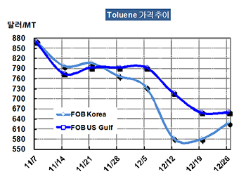 톨루엔 가격은 12월26일 FOB Korea 톤당 628달러로 48달러 급등했다.