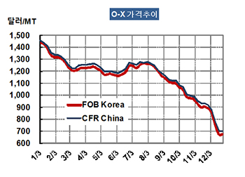 2014년 O-X 가격은 원료인 M-X 하락과 국제유가 폭락으로 초약세를 지속했다.
