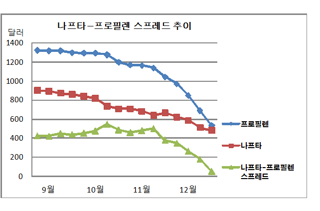 프로필렌(Propylene) 가격은 원료인 나프타(Naphtha) 가격에 비해 큰 폭으로 폭락하면서 스프레드가 급격히 좁혀지고 있어 국내 프로필렌 생산기업들의 마진이 빠르게 악화되고 있다.
