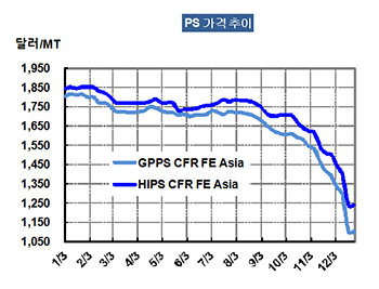 2014년 PS(Polystyrene) 가격은 수요 침체와 국제유가 폭락으로 추락했다.