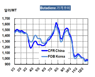 부타디엔 가격은 12월26일 FOB Kora 톤당 955달러로 하락세를 이어가며 2014년 거래를 마감했다.
