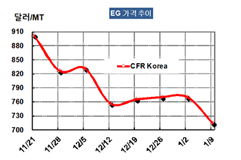 MEG 가격은 1월9일 CFR China 톤당 714달러로 56달러 폭락했다.