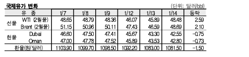 1월14일 국제유가는 저가 매수세 유입, 달러화 약세 등으로 상승했다.