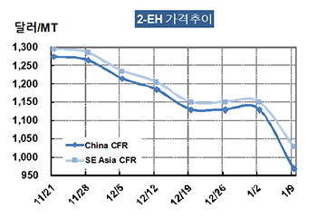 2-EH(2-Ethylhexanol) 가격은 1월8일 CFR China 톤당 161달러 폭락해 969달러를 기록하며 1000달러가 붕괴됐다.