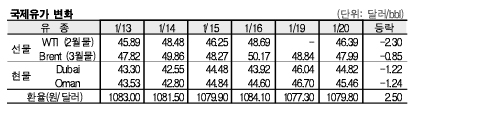 1월20일 국제유가는 IMF(국제통화기금)의 세계 GDP 성장률 전망치 하향조정과 석유수출기구(OPEC)의 낮은 감산 가능성 등으로 하락했다.