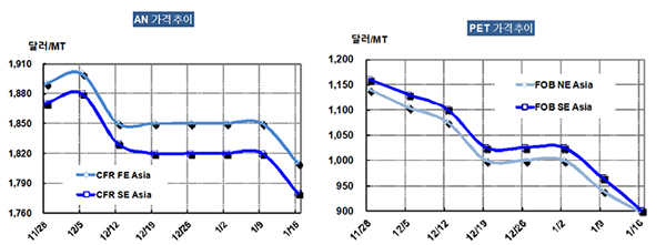 표,그래프: < AN 가격추이 >< PET 가격추이 > <화학저널 2015/01/22> |