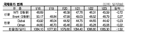 1월23일 국제유가는 브렌트유(Brent)는 미국경기 지표 호조 등의 영향으로 상승한 반면, WTI(서부텍사스 경질유)는 미국 정제시설 가동중단, 미국 달러화 강세 등의 영향으로 하락했다.
