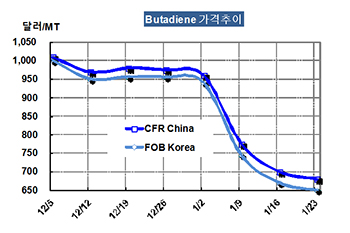 부타디엔 가격은 1월23일 FOB Korea 톤당 650달러로 20달러 하락했다.