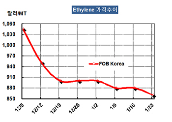 에틸렌 가격은 1월23일 FOB Korea 톤당 860달러로 20달러 하락했다.