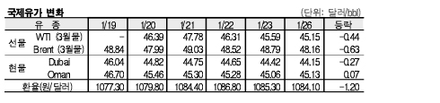 브렌트유, 48.16달러로 0.63달러 떨어져 … WTI도 45.15달러로 내림세