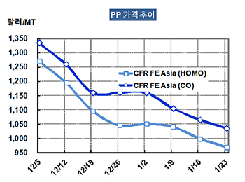 PP 가격은 1월21일 CFR FE Asia 톤당 968달러로 30달러 폭락했다.