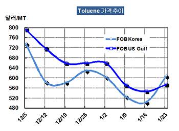 톨루엔 가격은 1월23일 FOB Korea 톤당 605달러로 102달러 폭등했다.