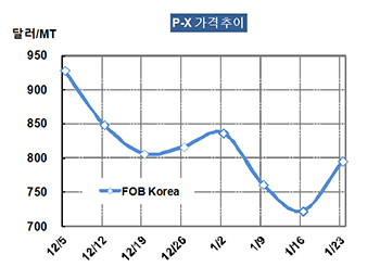 P-X 가격은 1월23일 FOB Korea 톤당 795달러로 73달러 폭등했다.