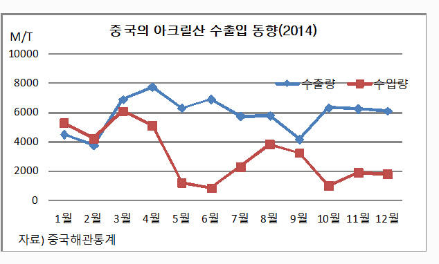 중국은 2014년 BASF-YPC, Zhejiang Satelite, Wanzhou Petrochemical, Formosa Plastic이 플랜트를 잇따라 신규가동한데 이어 2015년 Arkema가 Jiansu Jurong Chemical과 16만톤 플랜트를 가동할 예정이어서 수입 감소 지속이 불가피해지고 있다. ![]() 아크릴산과 아크릴산염 수입량은 2014년 1월 5270톤, 2월 4213톤, 3월 6073톤, 4월 5077톤에서 5월 1193톤, 6월 811톤으로 대폭 감소한 후 7월 2275톤, 8월 3813톤, 9월 3214톤으로 다시 회복했다. 그러나 10월 974톤으로 격감했고 11월 1883톤, 12월 1778톤으로 증가했으나 2012년 평균 4835톤과 비교해 2년 사이 50% 이상 급감했다. 반면, 수출은 증가세를 지속했다. 2014년 1월 4491톤에서 2월 3734톤, 3월 6889톤, 4월 7744톤, 5월 6295톤, 6월 6901톤, 7월 5730톤, 8월 5787톤, 9월 4153톤, 10월 6321톤, 11월 6251톤, 12월 6099톤으로 증감으로 반복했으나 비교적 안정적인 수준을 유지했다. 반면, 국산의 중국수출은 1월, 2월, 4월, 11월 없었고 3월 1톤, 5-7월 32톤, 8월 64톤, 9월, 12월 16톤, 10월 1톤으로 자취를 감추었다. <이민지 기자> <화학저널 2015/02/03> |