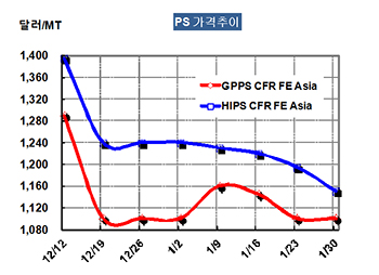 HIPS 가격은 1월30일 CFR China 톤당 1150달러로 45달러 폭락했다.