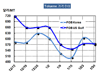 톨루엔 가격은 1월30일 FOB Korea 톤당 570달러로 35달러 급락했다.