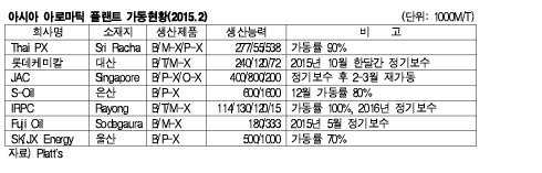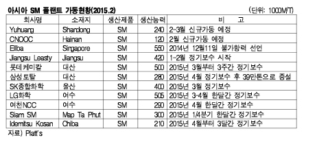 표, 그래프: < 아시아 SM 플랜트 가동현황(2015.2) >< 아시아 아로마틱 플랜트 가동현황(2015.2) > <화학저널 2015/02/04> |
