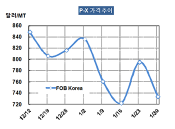 P-X 가격은 1월30일 FOB Korea 톤당 734달러로 61달러 폭락했다.