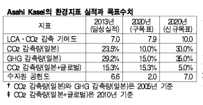 Asahi Kasei Chemical은 2020년 환경목표를 재수립하고 CO2 배출량 감축에 기여하는 정도를 나타낸 LCA․CO2 감축 기여도를 자사 배출량의 7.9배에 달하는 7.9에서 10.0으로 확대했다.