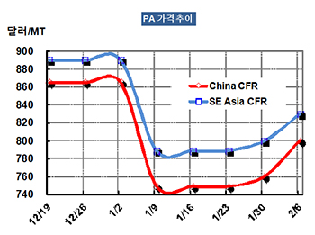 PA(Phthalic Anhydride) 가격은 2월5일 CFR China 톤당 800달러로 40달러 상승했다.