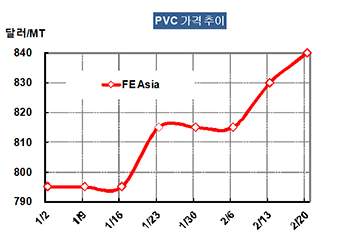 PVC 가격은 2월18일 CFR China 톤당 840달러로 10달러 상승했다.
