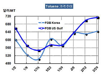 톨루엔 가격은 2월20일 FOB Korea 톤당 644달러로 14달러 상승했다.