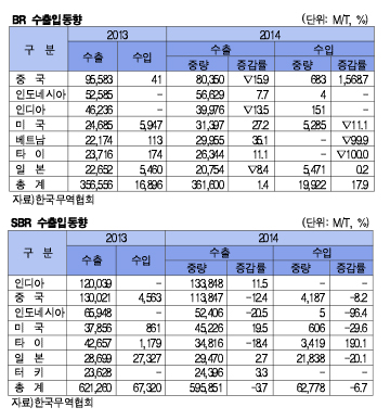 ![]() 다만, BR(Butadiene Rubber)·SBR(Styrene Butadiene Rubber) 등 합성고무는 현행 관세가 7.5%에서 한·중 FTA 이행 15년차인 2029년에는 완전히 무관세로 전환된다. 2014년 BR 전체 수출량은 36만1600톤으로 전년대비 1.4% 늘었고, 수입물량은 1만9922톤으로 17.9% 급증한 것으로 나타났다. 중국수출은 8만350톤으로 15.9% 감소했으나 수출비중은 22.2%에 달해 가장 높았고, 수입비중은 일본과 미국이 각각 27.5%, 26.5%로 압도적인 반면 중국산은 전년대비 16배 이상 급증했음에도 불구하고 3.4%로 여전히 미미했다. SBR 전체 수출량은 59만5851톤으로 3.7% 감소했고, 수입도 6만2778톤으로 6.7% 줄었다. 중국수출은 2013년 13만21톤으로 1위에 올랐으나 2014년에는 11만3847톤으로 인디아보다 2만1톤 적어 2위로 밀려났다. 수입은 일본산이 2만1838톤으로 34.8%에 달해 압도적이었고, 중국산은 4187톤으로 6.7%를 차지하며 큰 격차로 2위를 기록했다. <김원지 기자> 표,그래프: < BR 수출입동향 >< SBR 수출입동향 > <화학저널 2015/03/02> |