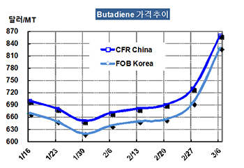 부타디엔 가격은 3월6일 FOB Korea 톤당 830달러로 135달러 폭등했다.