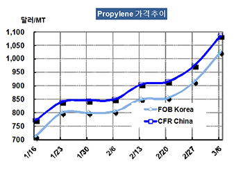 프로필렌 가격은 3월6일 FOB Korea 톤당 1025달러로 110달러 폭등했다.