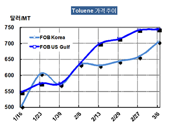 톨루엔 가격은 3월6일 FOB Korea 톤당 704달러로 46달러 급등했다.