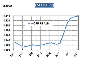 LDPE 가격은 3월11일 CFR FE Asia 톤당 1240달러로 20달러 급등했다.