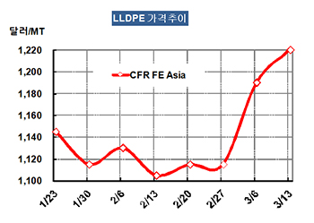 LLDPE 가격은 3월11일 CFR FE Asia 톤당 1220달러로 30달러 폭등했다.