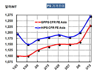 GPPS 가격은 3월11일 CFR China 톤당 1230달러로 70달러 폭등했다.