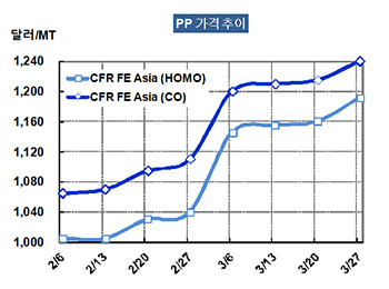 PP 가격은 3월25일 CFR FE Asia 톤당 1191달러로 31달러 폭등했다.